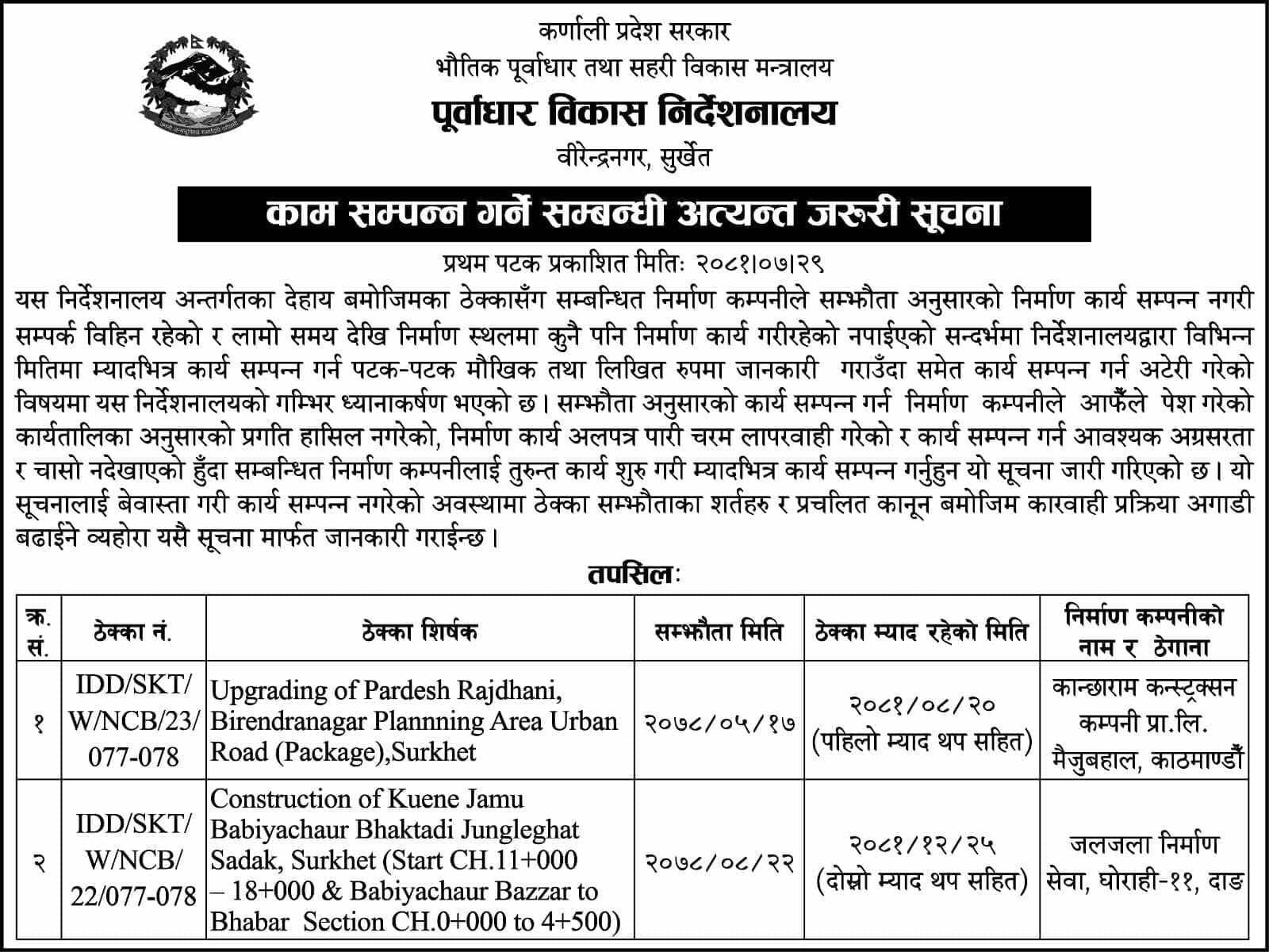 भौतिक पुर्वाधार तथा सहरी विकास मन्त्रालय अन्तर्गतको पुर्वाधार विकास निर्देशनालयले ठेकदार कम्पनी सम्पर्कविहीन भएको सुचना निकालेको हो ।