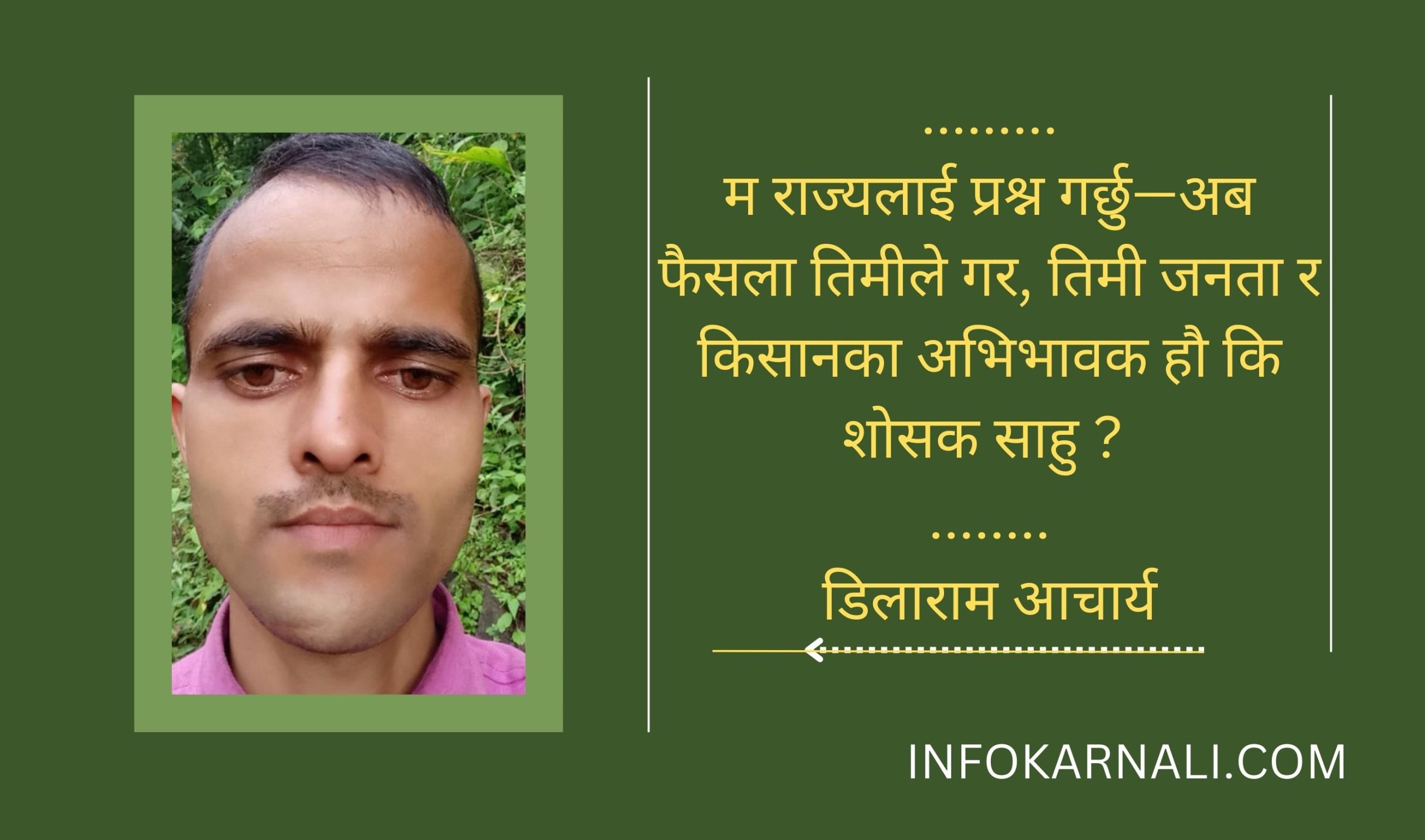तर व्यवहारमा कृषकलाई भिखारीको जस्तै अवस्था सिर्जना गरेको कुरा घाम जस्तै छर्लङ्ग छ । अनुदानको नाममा आश्वासन बाँड्ने, उत्पादन लागतभन्दा कम मूल्यमा कृषकका उत्पादन किन्ने, र प्राविधिक र वित्तीय सहयोगमा नितान्त अभाव देखाउने राज्यको संरचना किसानका लागि अभिभावक होइन, शोसकजस्तै छ ।