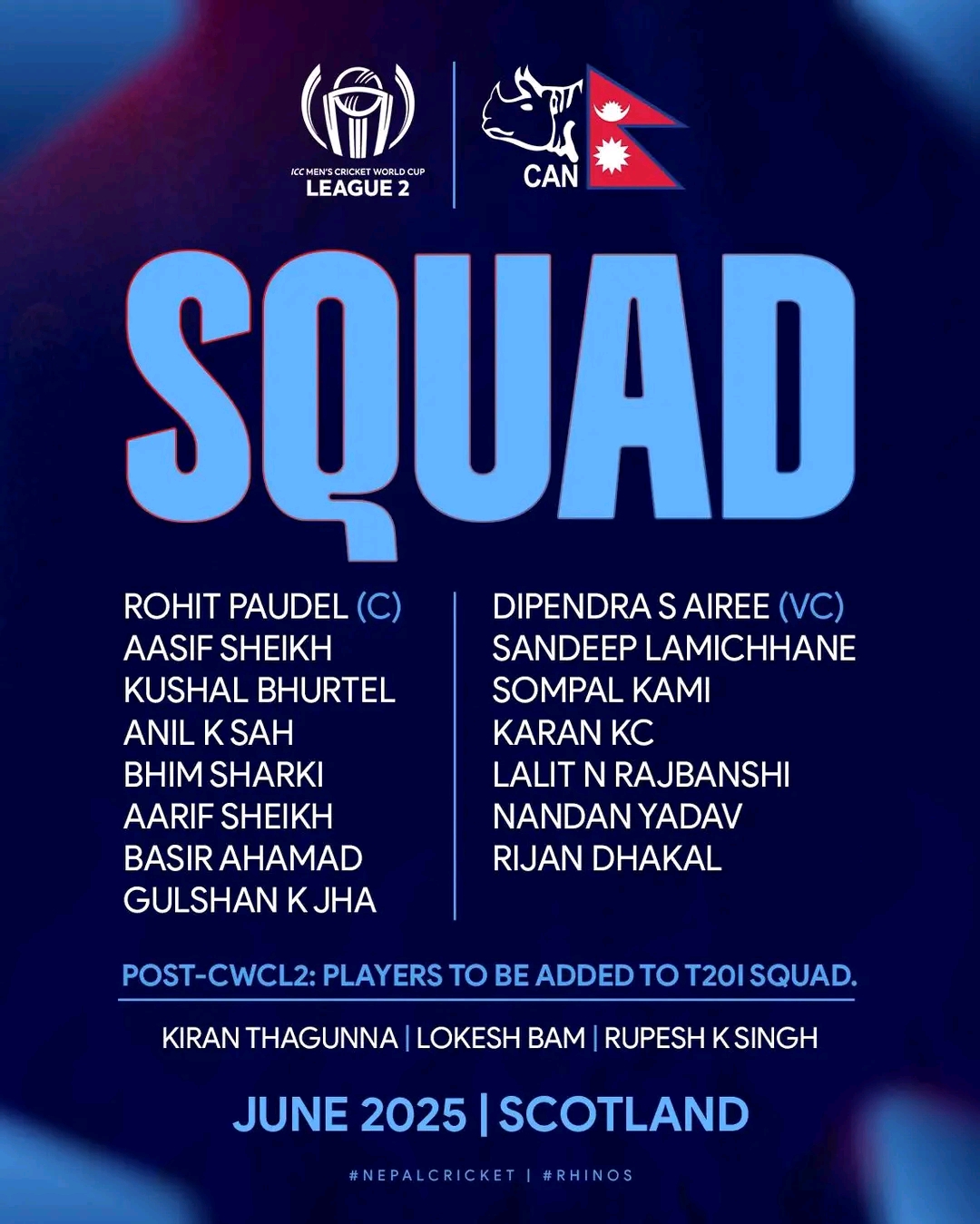 स्कटल्यान्डमा आगामी जुन २०२५ मा आयोजना हुने सिरिजका लागि टोलीको कप्तानी नियमित कप्तान रोहित पौडेलले गर्नेछन् भने उपकप्तानको जिम्मेवारी दिपेन्द्रसिंह ऐरीलाई दिइएको छ ।