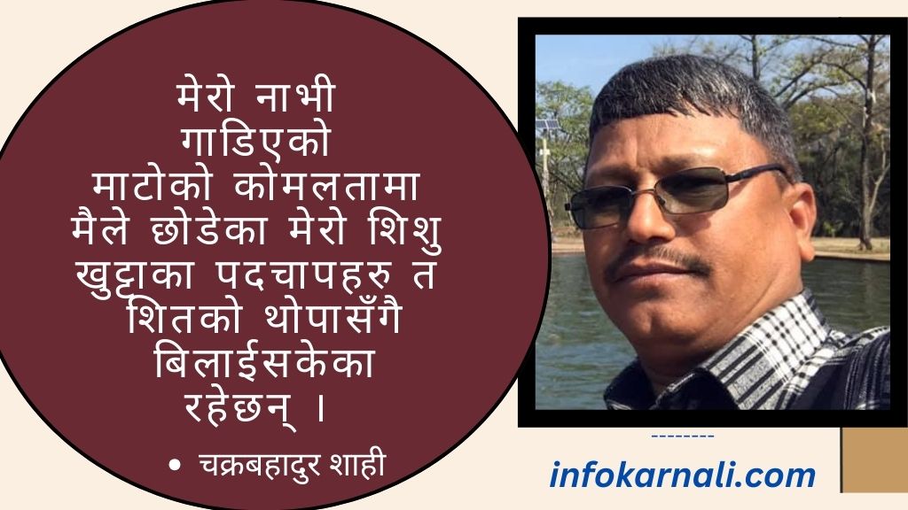 मलाई निकै खिन्नता, ग्लानी र पीडा महशुस भयो । मेरो नाभी गाडिएको माटोको कोमलतामा मैले छोडेका मेरो शिशु खुट्टाका पदचापहरु त शितको थोपासँगै बिलाईसकेका रहेछन् ।